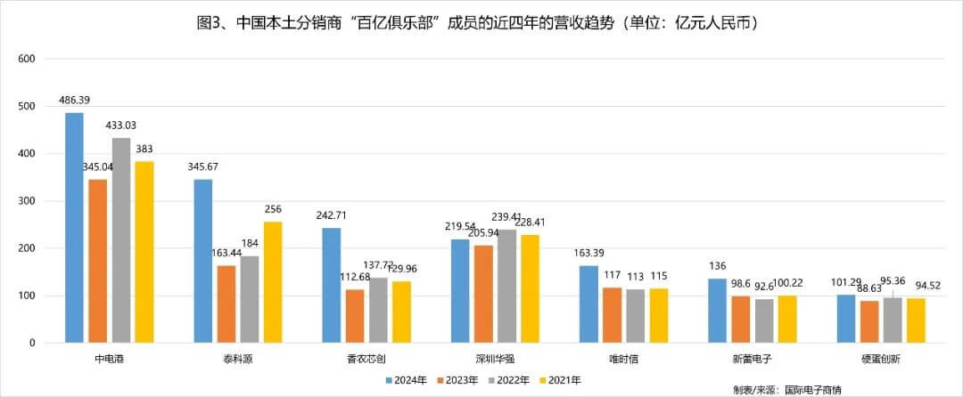 根據(jù)傳統(tǒng),《國(guó)際電子商情》將營(yíng)收超百億元的元器件分銷商劃分為“百億俱樂部”。2024年共有7家中國(guó)本土分銷商營(yíng)收超百億,同比2023年增加2家,中電港、泰科源、香農(nóng)芯創(chuàng)為TOP3。