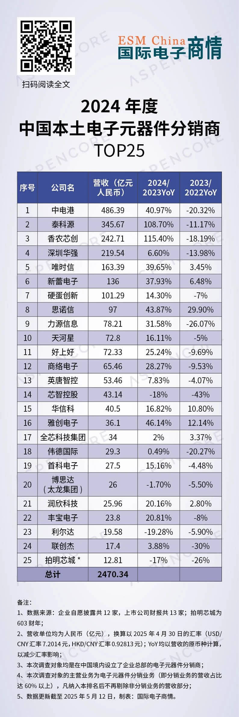 2024年度排名延續(xù)了往年的標(biāo)準(zhǔn),調(diào)查對(duì)象均是在中國(guó)境內(nèi)設(shè)立了企業(yè)總部的電子元器件分銷商,且主營(yíng)業(yè)務(wù)為電子元器件分銷(即分銷業(yè)務(wù)的營(yíng)收占比達(dá)60%以上),納入本排名后不再剔除非分銷業(yè)務(wù)的營(yíng)收部分。所有排名數(shù)據(jù)均來源于企業(yè)自愿披露和上市公司財(cái)報(bào)。