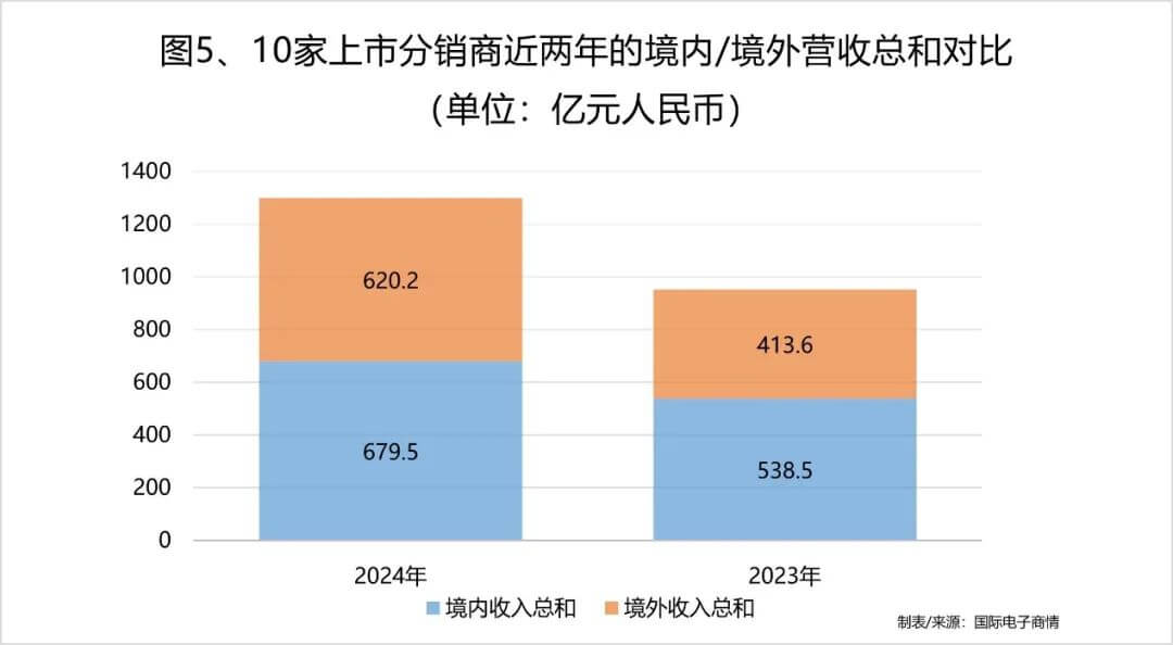 可見,2024年境外收入增長(zhǎng)更多,無論是絕對(duì)值還是增長(zhǎng)率都高于境內(nèi)。以下分析幾家從境外市場(chǎng)獲顯著收益的分銷商: