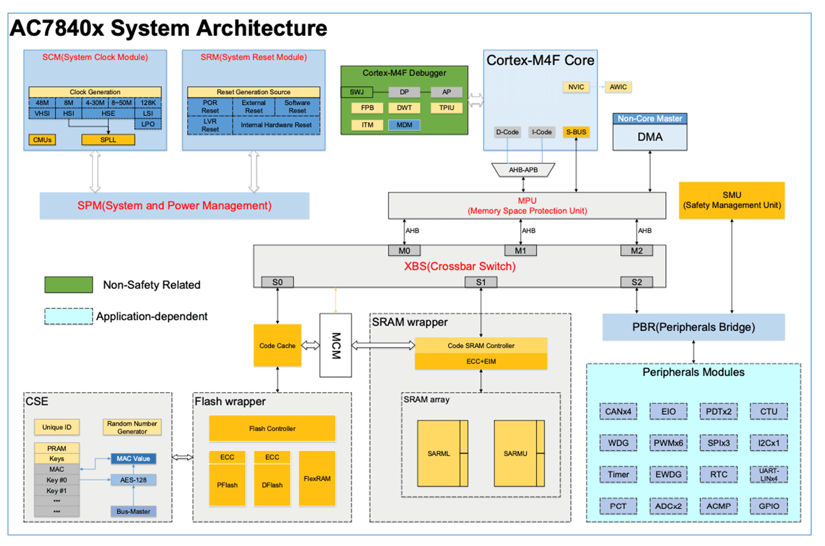 AC7840x是基于ARM Cortex-M4F內(nèi)核的車規(guī)級MCU,于2022年上市。產(chǎn)品符合AEC-Q100 Grade1, 功能安全符合ISO 26262 ASIL-B,信息安全符合SHE標(biāo)準(zhǔn),支持安全啟動。軟件生態(tài)支持AUTOSAR MCAL4.4,可提供MCAL及配置工具。產(chǎn)品擁有雙Bank Flash用于存儲程序,支持OTA。AC7840x可廣泛應(yīng)用于汽車車身、座艙、車燈、新能源以及電機控制等應(yīng)用領(lǐng)域。