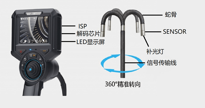 工業(yè)內(nèi)窺鏡主要由補(bǔ)光燈、SENSOR、蛇骨、信號傳輸線、ISP(圖像信號處理器)、解碼芯片、LED顯示屏組成,由于從SENSOR傳輸出來的圖像是原始圖像所以需要使用ISP在經(jīng)過BLC、AE、AWB、2D\3D降噪等圖像處理后使圖像達(dá)到客戶想要的視覺效果,并通過編解碼芯片對視頻進(jìn)行編解碼處理以保證內(nèi)窺鏡長距離、高質(zhì)量的視頻傳輸效果。