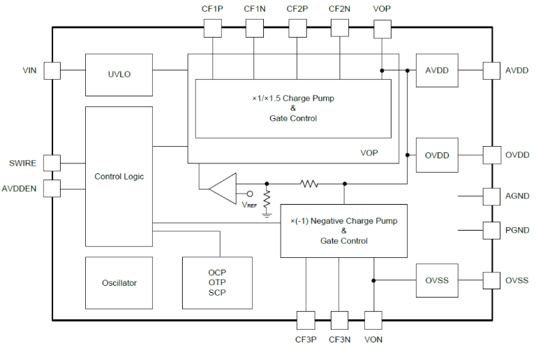 SGM38045是一顆采用×1/×1.5自適應(yīng)模式電荷泵結(jié)構(gòu)的無電感小尺寸AMOLED電源。以3.3V輸出為例,當電源電壓VIN高于3.7V時,主電荷泵工作在1倍壓輸出的Bypass直通模式,主輸出電壓VVOP≈VIN;當電源電壓VIN低于3.7V時,主電荷泵工作在1.5倍壓輸出的模式。此后經(jīng)AVDD、OVDD兩個LDO分別產(chǎn)生AVDD、OVDD兩個正壓輸出;經(jīng)負壓電荷泵(×(-1)NegaTIve Charge Pump),和LDO OVSS產(chǎn)生負壓OVSS。