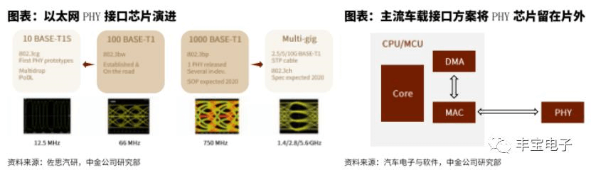 車(chē)載以太網(wǎng)目前已廣泛布局各車(chē)型中,深入ADAS系統(tǒng)。在硬件層面,車(chē)載以太網(wǎng)的接口電路主要由MAC控制器和物理層接口PHY芯片兩大部分構(gòu)成。集成方式上,嵌入式芯片廠商一般會(huì)將MAC集成在MCU/CPU內(nèi)部,而PHY芯片則由OEM或控制器供應(yīng)商提供獨(dú)立芯片。PHY與MAC之間通過(guò)MII接口(media independent interface,媒體獨(dú)立接口),在MAC結(jié)構(gòu)不發(fā)生變化的情況下,更換不同PHY芯片不會(huì)影響車(chē)內(nèi)通信。