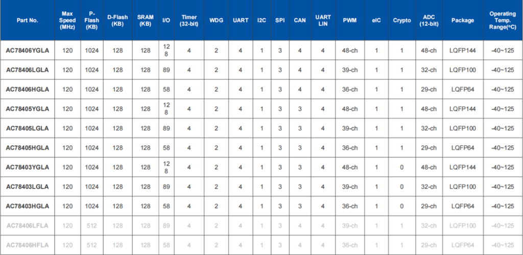 ◆ 杰發(fā) AC784x: 基于ARM? Cortex-M4F內(nèi)核的車規(guī)級(jí)MCU功能安全特性符合ISO26262功能安全ASIL-B和AEC-Q100 Grade 1等級(jí),支持適配AUTOSAR V4.4