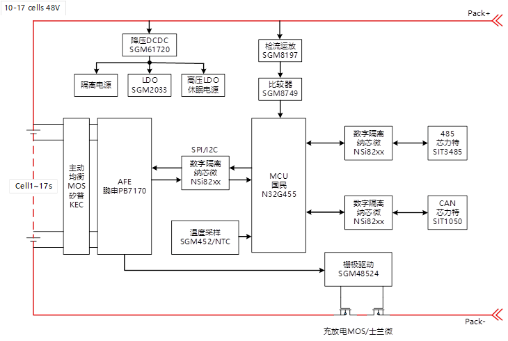 母線電壓取決于儲能電池系統(tǒng),48V系統(tǒng)為例,一級降壓BUCK及休眠LDO耐壓60V,如SGM61720/SGM61630;隔離電源有專用隔離電源芯片,或變壓器隔離分立方案等。