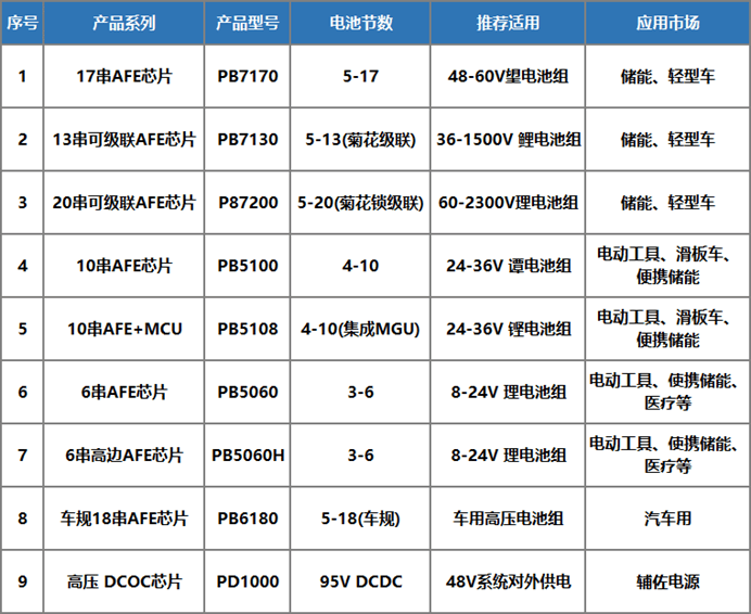 鵬申P(guān)B7170(17串電池AFE)是工業(yè)48V/60V鋰電池組標準解決方案芯片, 廣泛應用于電動自行車、機器人、UPS等領(lǐng)域。此外PB7130/PB7200分別單顆支持4-13/20串電池級聯(lián)應用,且可擴展菊花鏈,可實現(xiàn)24V-400V三元或磷酸鐵理電池組管理,為儲能市場提供極佳的多樣選擇。
