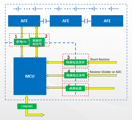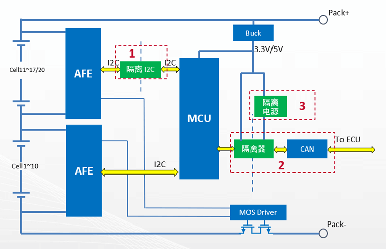 BMS上有低壓電路,也有高壓電路,高低壓電路之間是需要進行通信的,如AFE與MCU之間SPI/I2C/UART通信,及MCU與外界CAN/RS485通信;高電壓電路通信需設計良好隔離,以隔絕直流,, 保護操作人員和低壓電路免受高電壓影響, 防止通信子系統(tǒng)之間的地電位差, 改善抗噪性能。