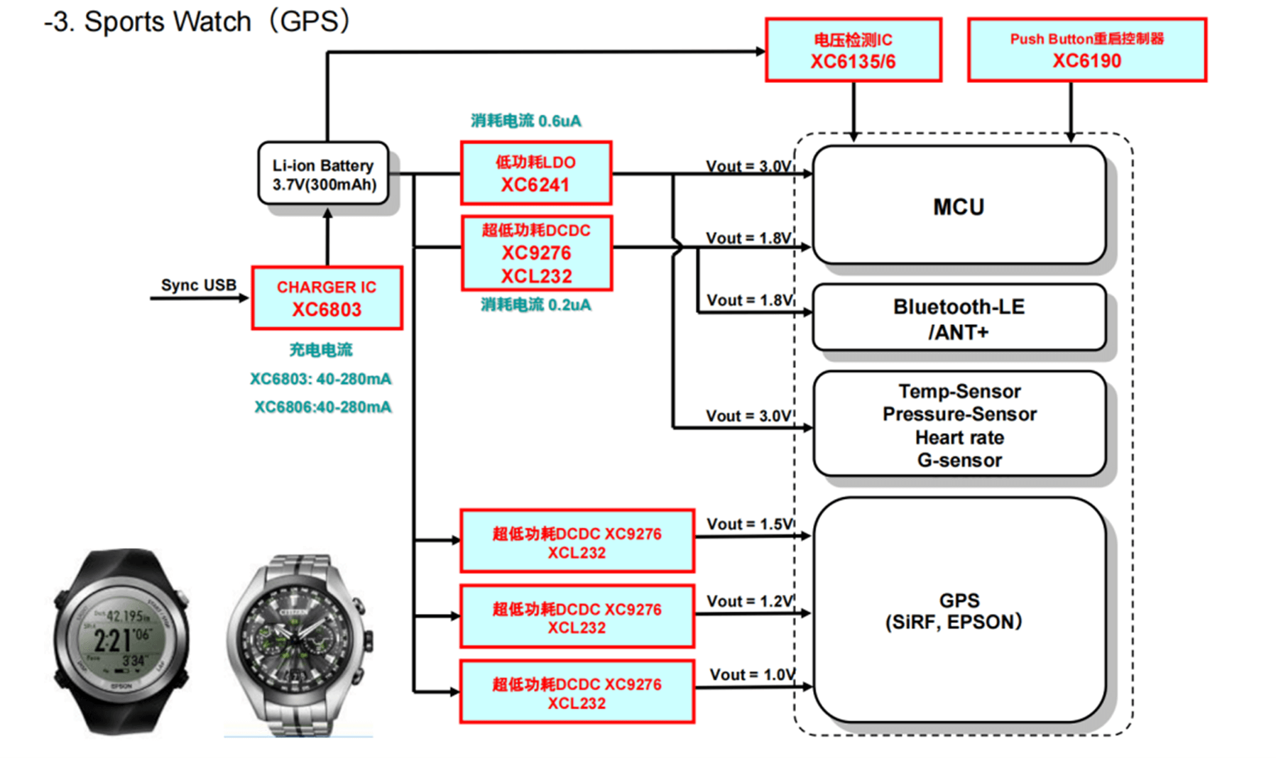 另外此產(chǎn)品中也有電壓檢測(cè)器XC6126系列和電源穩(wěn)壓芯片XC6504系列的機(jī)會(huì)。XC6126系列產(chǎn)品是超小型, 高精度電壓檢測(cè)器IC。由于采用了CMOS工藝, 高精度基準(zhǔn)電源, 激光微調(diào)技術(shù)實(shí)現(xiàn)了包括溫度漂移在內(nèi)的高精度, 低消耗電流。有N溝道開(kāi)漏和CMOS兩種輸出。備有USPN-4B02及SSOT-24兩種超小型封裝,適用于便攜式儀器的小型化, 高密度實(shí)裝產(chǎn)品。XC6504系列產(chǎn)品實(shí)現(xiàn)了0.6μA超低消耗電流的電壓穩(wěn)壓器。此外,在輸出電流為1μA(輕負(fù)載)時(shí),也能得到穩(wěn)定的電壓,最適用于只需少量輸出電流的應(yīng)用目的。加上采用了0.75×0.95 mm的超小型封裝USPN-4B02,對(duì)應(yīng)了無(wú)穩(wěn)定輸出用電容(CL),可以大幅度減少實(shí)裝面積,非常符合小型化產(chǎn)品的需求。