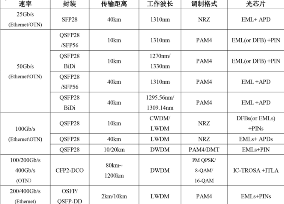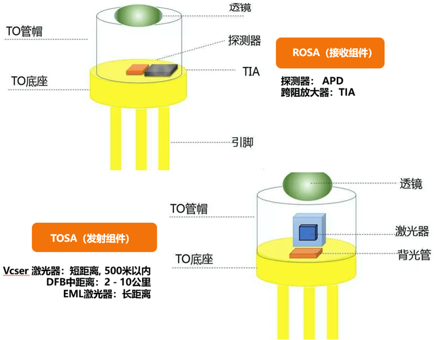 - ROSA:實(shí)現(xiàn)光/電轉(zhuǎn)換,主要包括PD/APD、DeMux、耦合組件等,封裝類型一般和TOSA相同。PD用于短距、中距的光模塊,APD主要應(yīng)用于長(zhǎng)距光模塊。