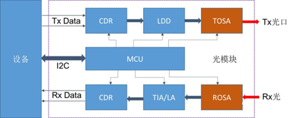 - MCU:負(fù)責(zé)底層軟件的運(yùn)行、光模塊相關(guān)的DDM功能監(jiān)控及一些特定的功能。DDM監(jiān)控主要實(shí)現(xiàn)對(duì)溫度、Vcc電壓、Bias電流、Rx power、Tx power 5個(gè)模擬量的信號(hào)進(jìn)行實(shí)時(shí)監(jiān)測(cè),通過這些參數(shù)判斷光模塊的工作狀況,便于光通信鏈路的維護(hù)。