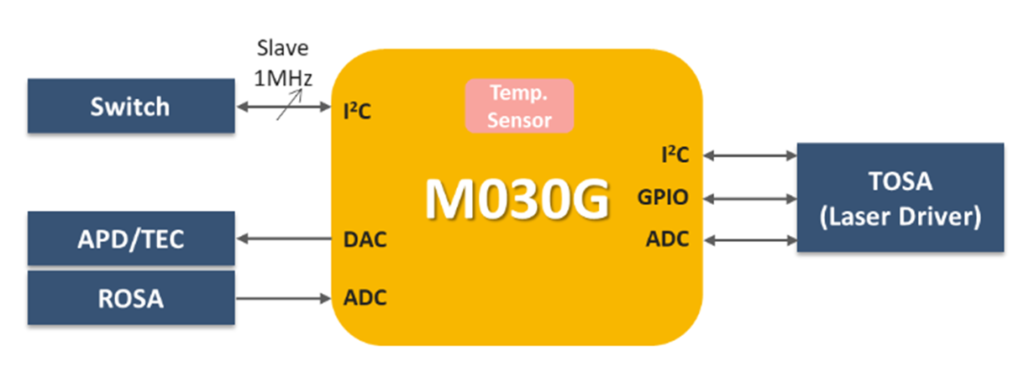光模塊兩端分別連接了電口及光口,并在電口端利用I2C與上位機(jī)溝通。光模塊光功率會(huì)受溫度變化的影響,需監(jiān)控光模塊的溫度,并提供參考電壓做調(diào)整。因此MCU須具備量測(cè)溫度的能力—溫度傳感器,以及測(cè)量和調(diào)整電壓的能力—ADC/DAC。此外光模塊封裝尺寸狹小,因此 MCU 也必須為小封裝。