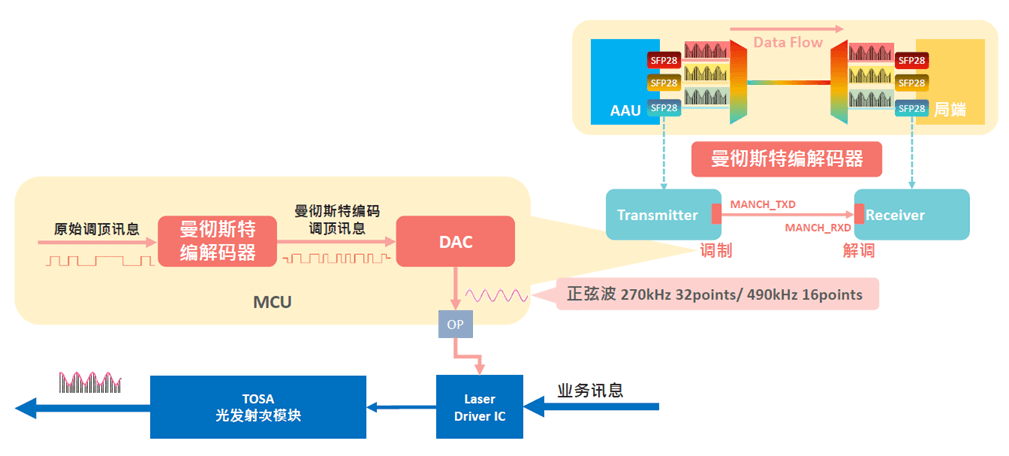在SDH/WDM網(wǎng)絡(luò)中,每個(gè)波道通常會(huì)傳輸兩類信息,一類是業(yè)務(wù)信息,另一類是監(jiān)控和管理相關(guān)信息。監(jiān)控與管理信息,一般依附于業(yè)務(wù)信息傳遞,或使用獨(dú)立的通道資源。如果不使用獨(dú)立的通道,那么就需要調(diào)頂技術(shù)。調(diào)頂信號(hào)是在業(yè)務(wù)信號(hào)上迭加一個(gè)小幅度的信號(hào),因此又稱為低頻微擾信號(hào)。此信號(hào)需以曼徹斯特碼做傳遞,即可利用信號(hào)的變化來保持發(fā)送和接收之間的同步。為產(chǎn)生及接收曼徹斯特碼,光模塊需具備曼徹斯特編解碼器,此處為調(diào)頂光模塊和通用光模塊最大的差異。