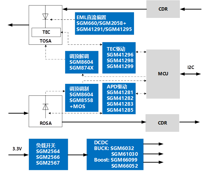 圣邦微針對(duì)光模塊,小基站等通信設(shè)備新推出一系列產(chǎn)品,涵蓋TEC\EML\APD驅(qū)動(dòng),小封裝DCDC,負(fù)載開關(guān),電壓監(jiān)控,I2C電平轉(zhuǎn)換,及信號(hào)鏈高速/高精運(yùn)放,高速比較器等,全面助力光模塊設(shè)計(jì)。