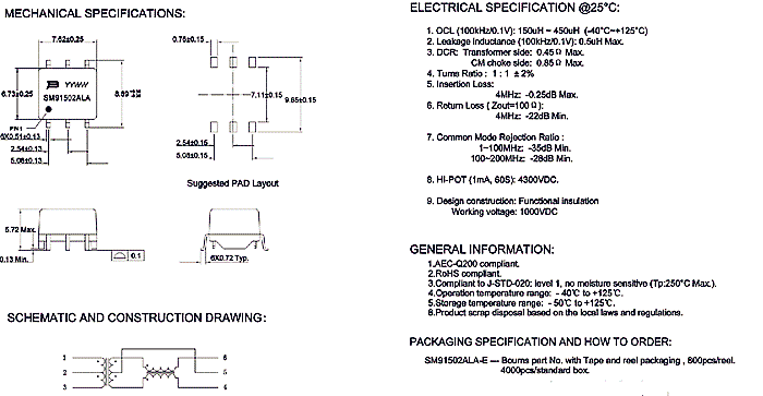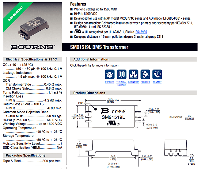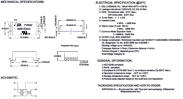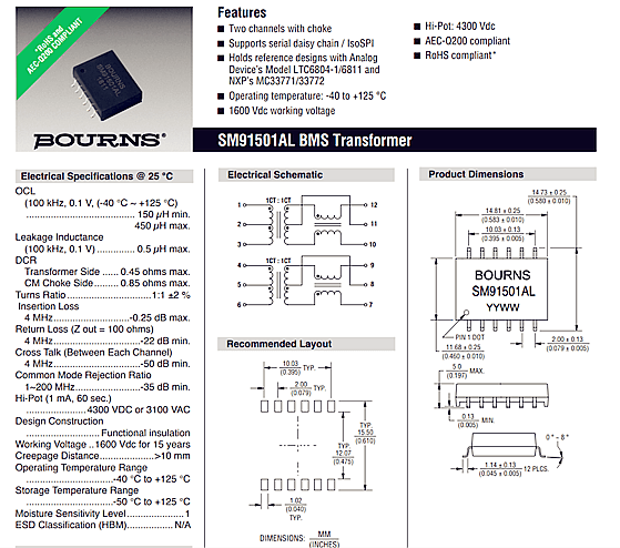 針對于有絕緣耐壓需求的方案,Bourns推出了加強(qiáng)絕緣的隔離變壓器SM91534AL-E和SM91519L-E。