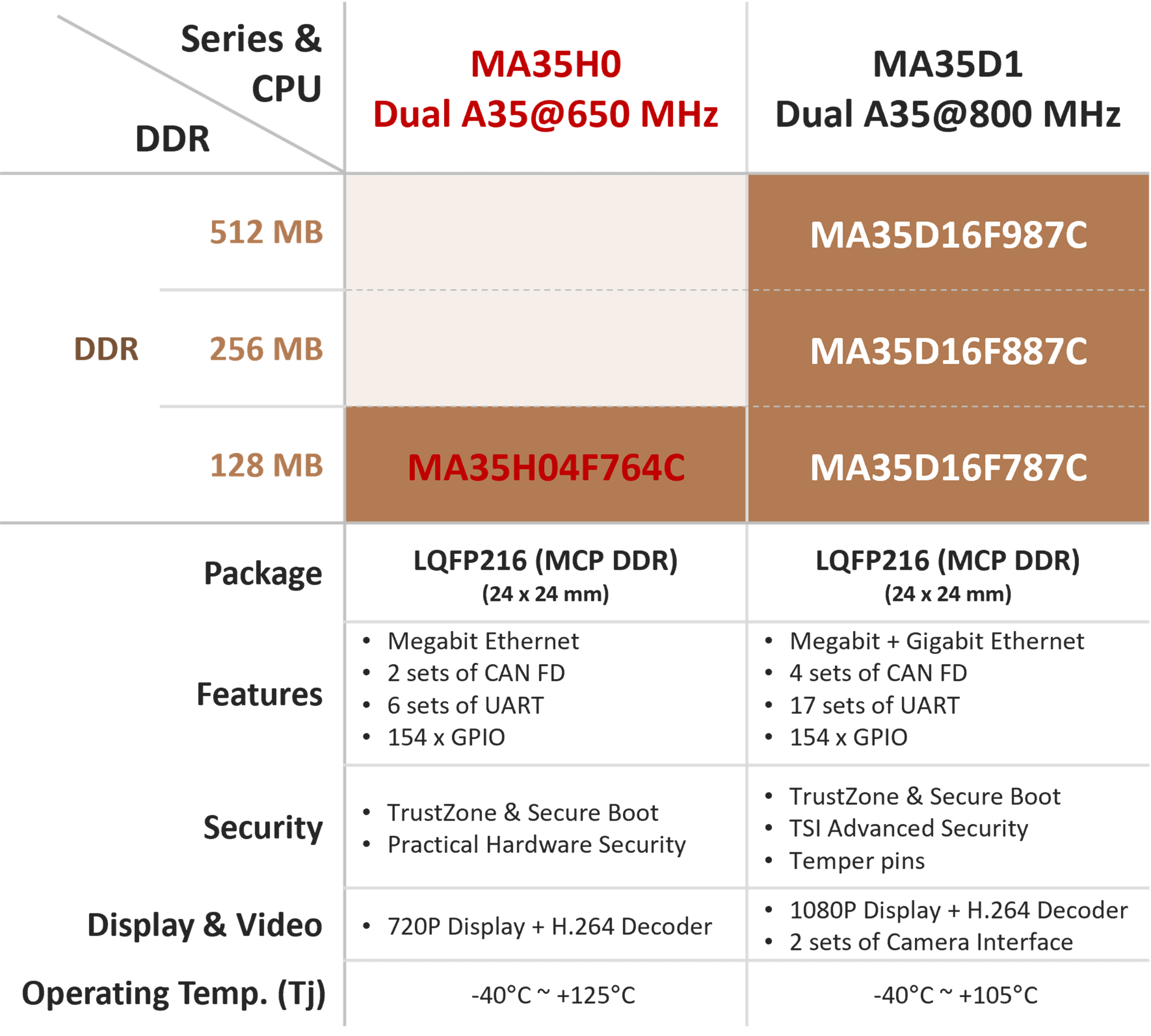 MA35H0 系列支持 USB、SD/eMMC、NAND 和 SPI Flash(SPI NOR/SPI NAND)四種模式的安全啟動(dòng)。為了簡化系統(tǒng)設(shè)計(jì)和制造,MA35H0 系列也提供堆棧 128 MB DDR 的 LQFP 封裝,可顯著減少 PCB 層數(shù)、尺寸和電磁干擾(EMI)。