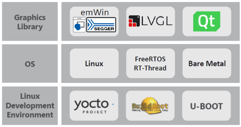 - 繪圖函式庫:支持 emWin、Qt 及 LVGL,讓使用者可以創(chuàng)造令人驚嘆的繪圖用戶接口 (GUI)