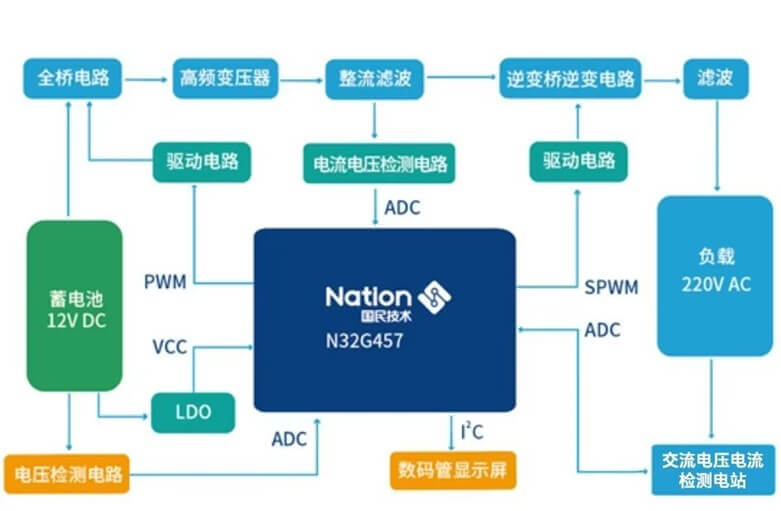 下圖是基于 N32G457 系列通用 MCU 實現(xiàn)的一個車載逆變器應用方案結構框圖。該逆變器將車載電瓶的12VDC 轉換為220V 純正弦波 AC 供負載設備使用,輸出功率可達 1200W。該車載逆變器具有啟動速度快、轉換效率高,帶負載適應性與穩(wěn)定性強的特點,產品具備短路、過載、過/欠電壓、超溫等保護功能,安全性能好。