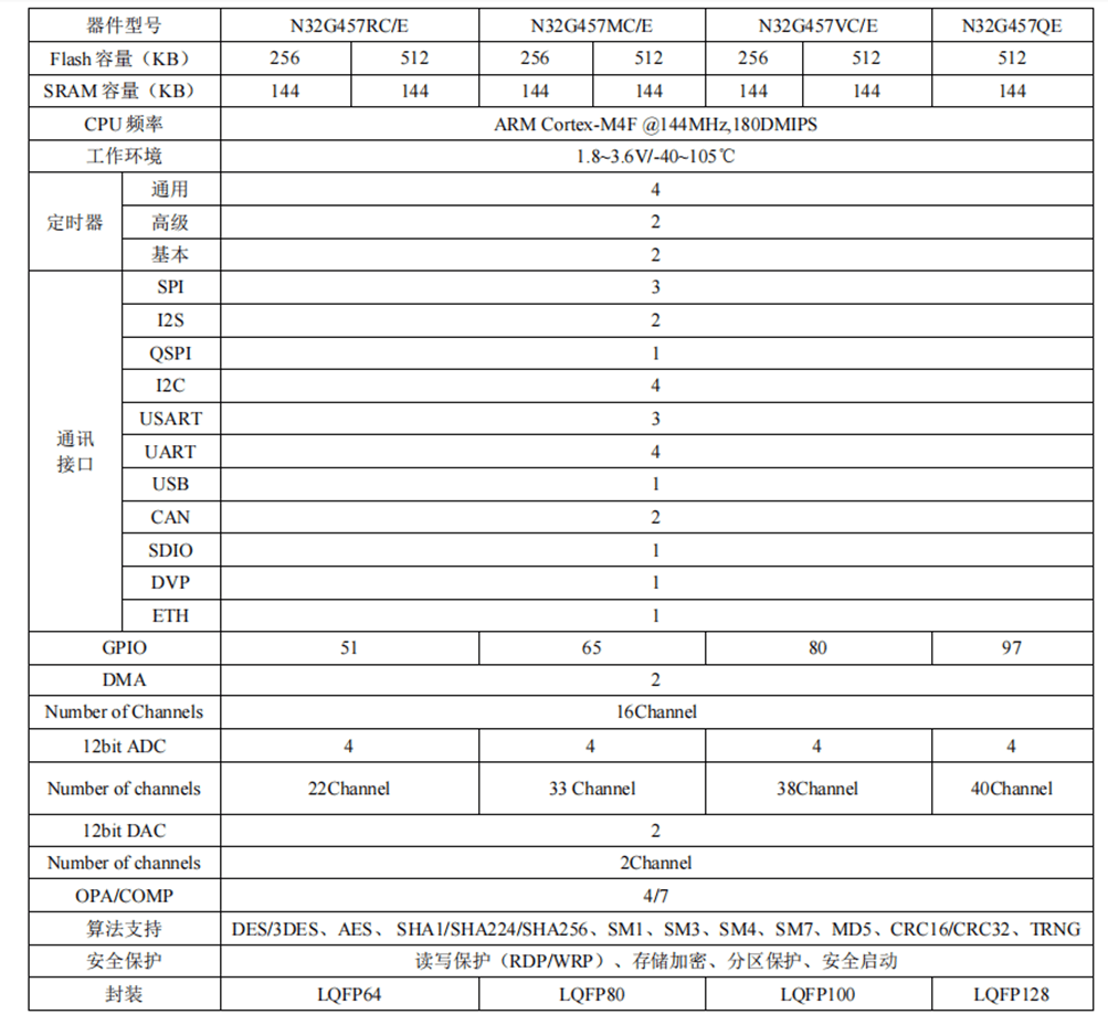 N32G457 系列采用 32 bit ARM Cortex-M4 內核,最高工作主頻 144MHz,支持浮點運算和 DSP 指令,集成多達 512KB Flash,144KB SRAM,內置 4 個 12bit 5Msps ADC,4 路獨立軌到軌運算放大器,7 個高速比較器,2 個 1Msps 12bit DAC,具體主要資源如下: