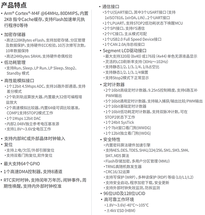 - 行業(yè)領(lǐng)先的低功耗水平,更加低碳環(huán)保。芯片動態(tài)運行功耗低至60μA/MHz,靜態(tài)功耗低至1.5μA。