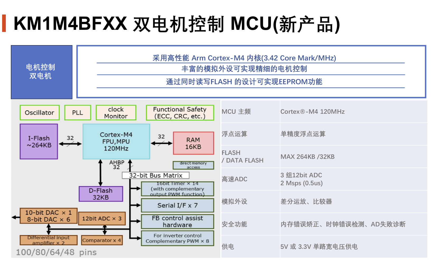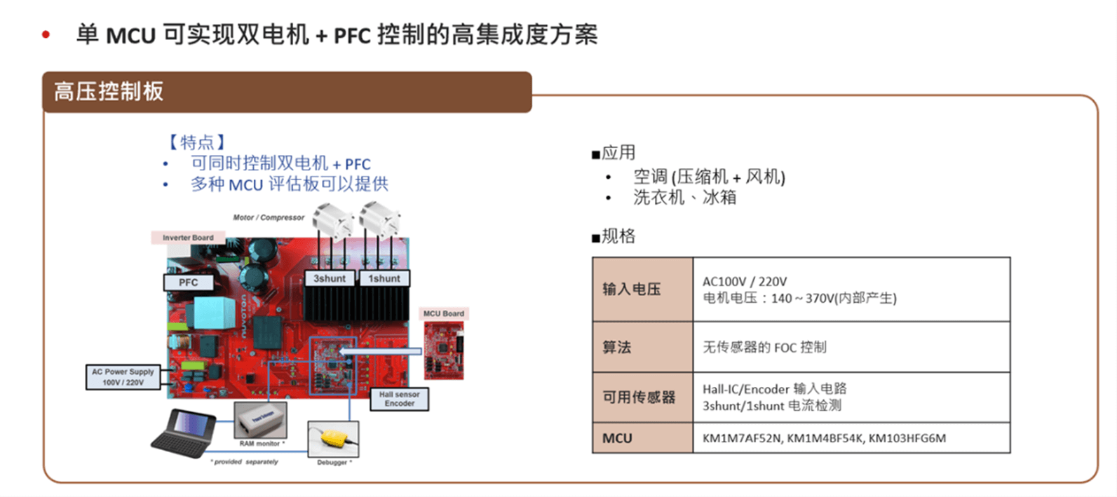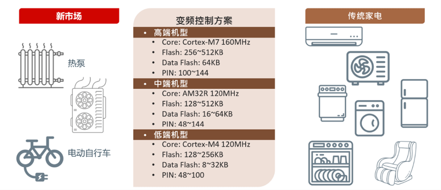 針對(duì)家用空調(diào)和熱泵市場(chǎng)的應(yīng)用推出了全新的M4系列內(nèi)核產(chǎn)品,實(shí)現(xiàn)了單MCU 控制雙電機(jī)+高頻PFC的解決方案。