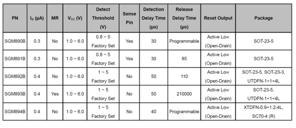 - 靈活可調(diào)的釋放延時,可以實現(xiàn)系統(tǒng)復(fù)位功能(SGM890/4/5/6/7/8/9);