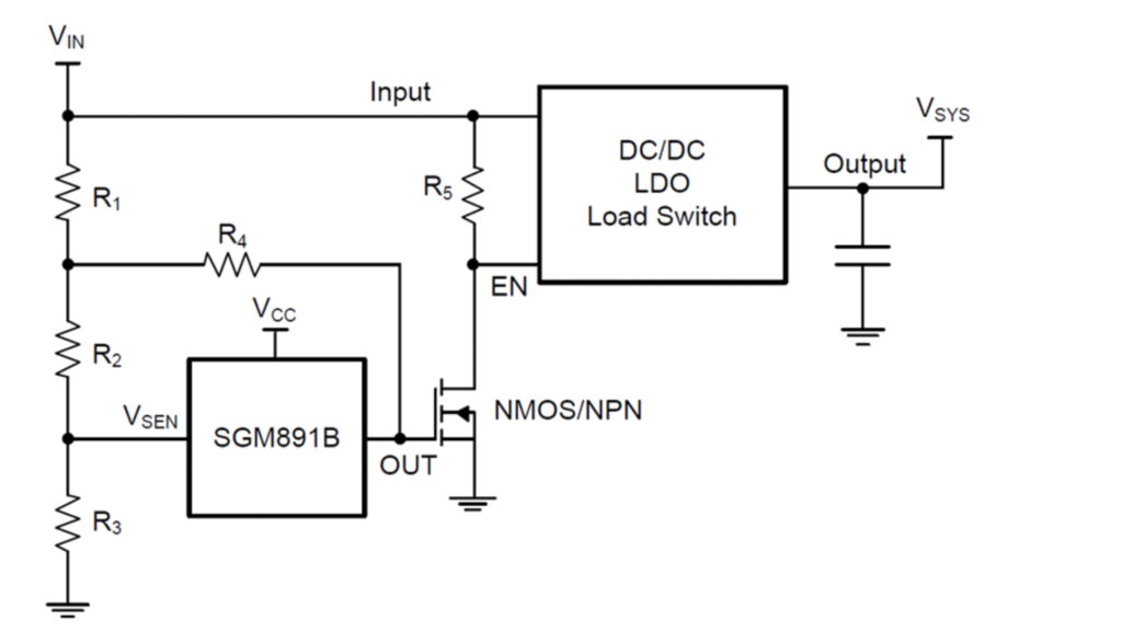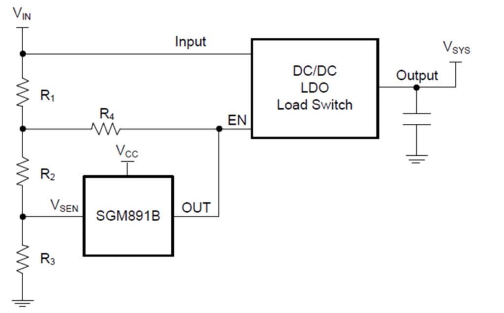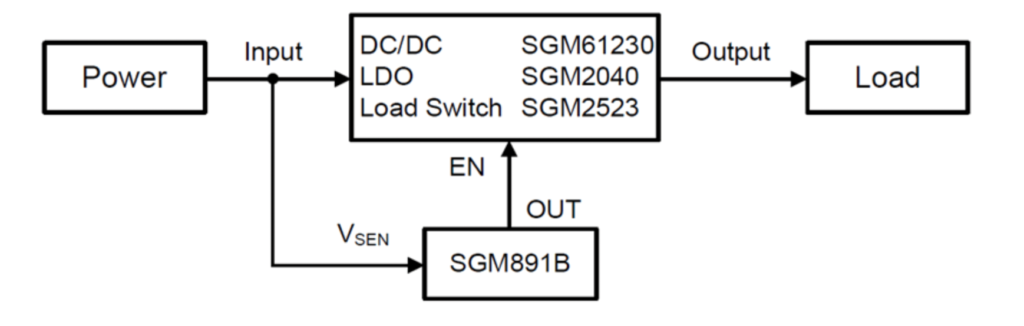 應(yīng)用框圖所示,電源輸出接后級DC/DC、LDO或負載開關(guān),同時采用電壓監(jiān)控器SGM891B監(jiān)控電源的輸出電壓,電壓監(jiān)控器輸出端OUT控制DC/DC(SGM61230等)、LDO(SGM2040等)或負載開關(guān)(SGM2523等)的使能端EN。在實際應(yīng)用中:
