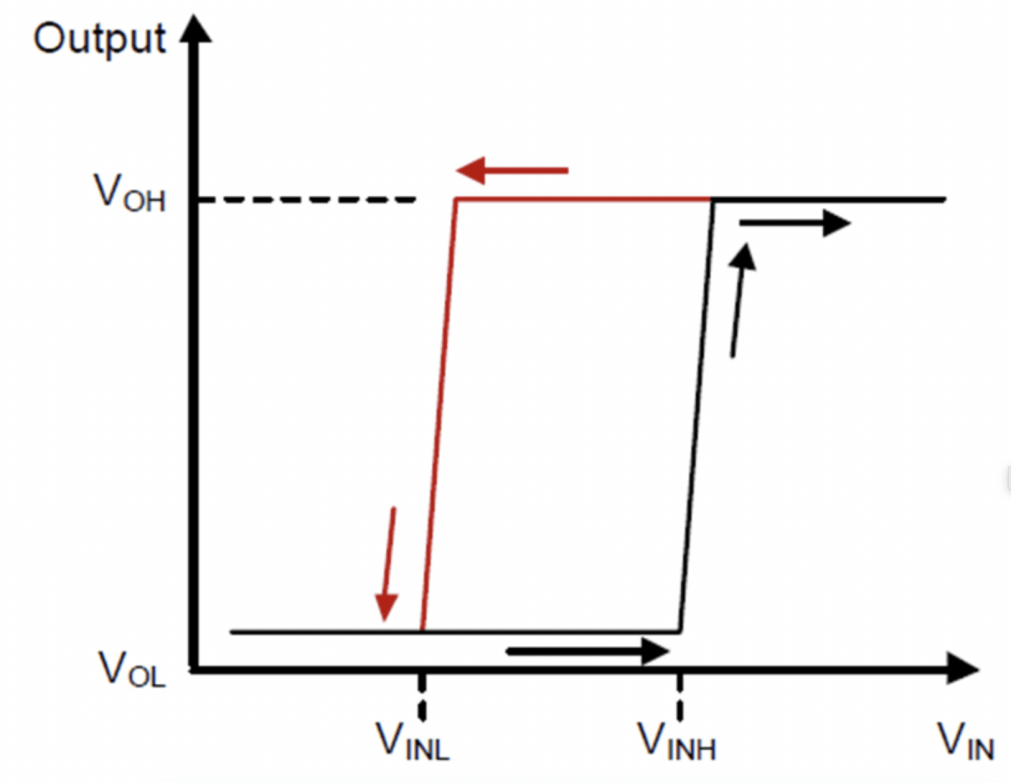 1. 欠壓保護+過門限打開功能:即輸入電壓高于VINH時打開DC/DC、LDO或負載開關(guān),接通后級負載供電;同時在電源電壓低于VINL時關(guān)閉DC/DC、LDO或負載開關(guān)以斷開負載供電。輸入電壓VIN和電壓監(jiān)控器輸出端OUT(即DC/DC、LDO或負載開關(guān)的EN)的邏輯關(guān)系如下,從圖中可以看出該電路實現(xiàn)一個遲滯比較器的功能。