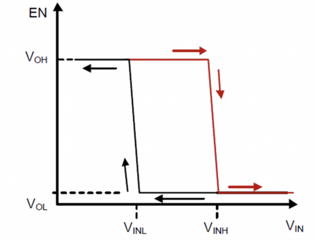 2. 過壓關(guān)斷+遲滯打開功能:即輸入電壓高于VINH時關(guān)斷DC/DC、LDO或負載開關(guān),斷開后級負載供電;同時在電源電壓低于VINL時打開DC/DC、LDO或負載開關(guān)以接通負載供電。輸入電壓VIN和DC/DC、LDO或負載開關(guān)使能端EN的邏輯關(guān)系如下,從圖中可以看出該電路實現(xiàn)一個遲滯比較器的功能。