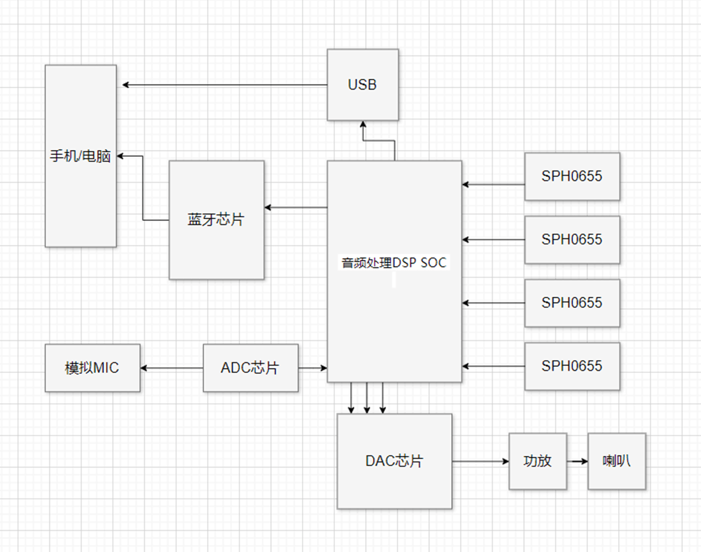 系統(tǒng)主要包括DSP頻處理芯片、ADC芯片、DAC芯片、功率放大器、喇叭、數(shù)字麥克風陣列等, 音箱通過麥克風陣列拾音后將音頻信號輸出到音頻處理芯片,電腦或手機給到音頻處理芯片的音頻信號作為AEC(回聲消除)參考源,再通過音頻處理芯片內(nèi)部AEC算法做回音消除,電腦或手機通過USB接口9或藍牙與會議音箱連接,將遠端說話者的聲音直接通過會議音箱的喇叭5播放出來。