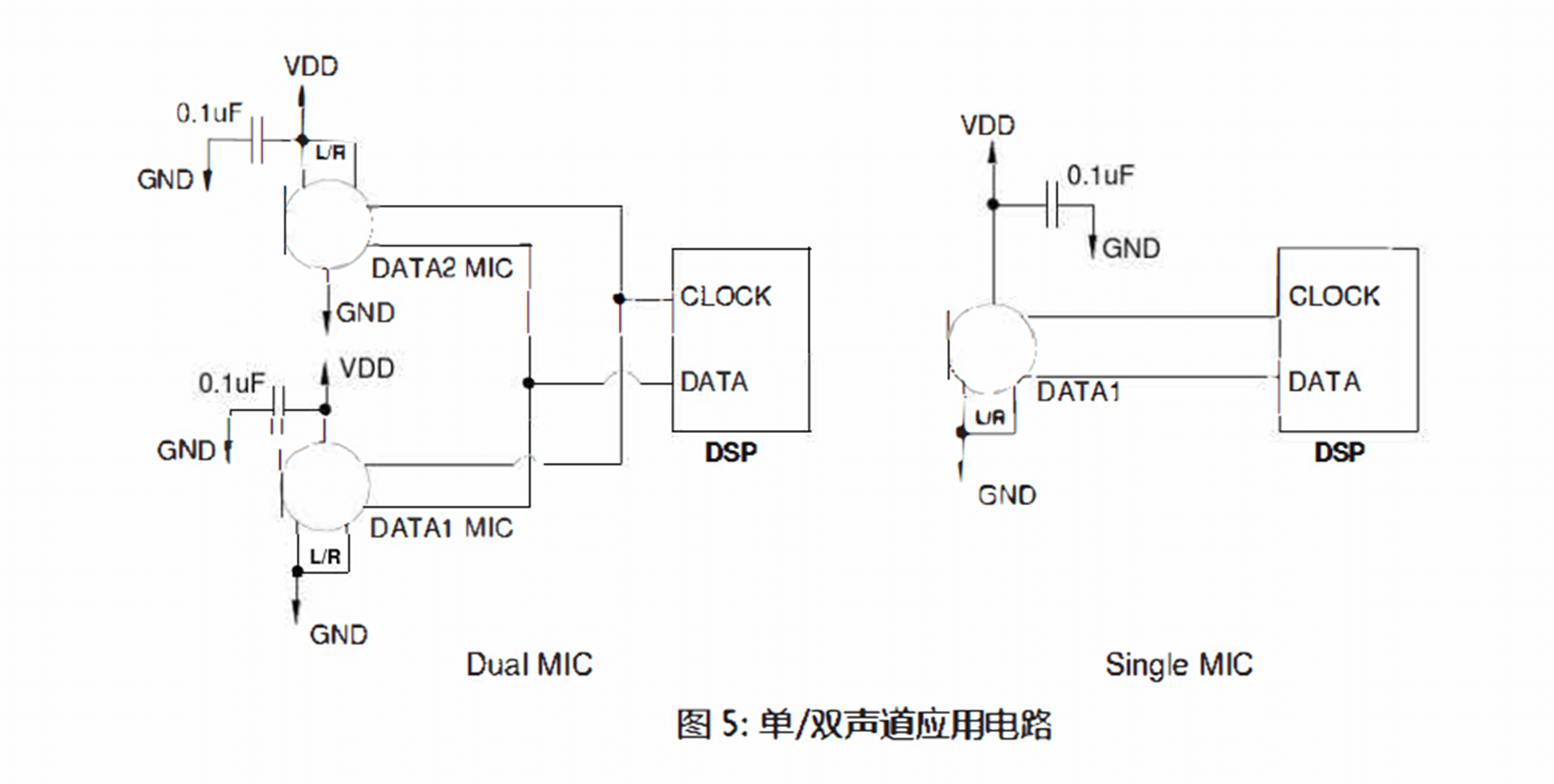 客戶可通過對L/R引腳的設(shè)置實現(xiàn)MEMS MIC單聲避或者雙聲道的使用 , 一般情況下 , 單MIC使用時 ,建議客戶將 L/R引腳接地 , 避免電涌噪聲的影響;雙MIC使用時 , 可將兩個MIC的輸出并聯(lián)走一條輸出線,下面給出單MIC和雙MIC的使用連接圖: