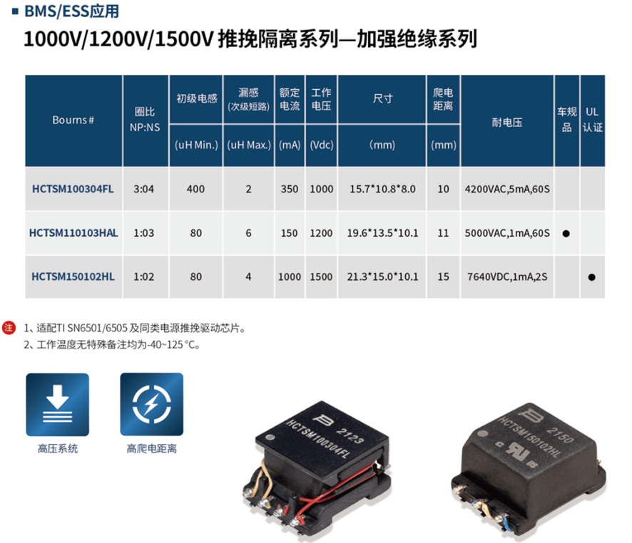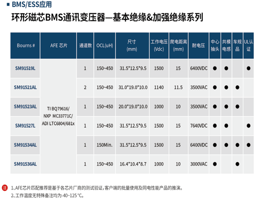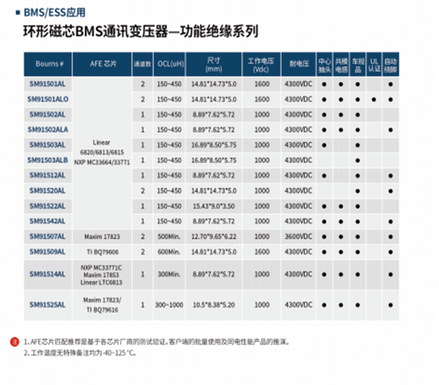 Bourns的信號(hào)類(lèi)隔離變壓器適用于市場(chǎng)上主流的BMS芯片廠商。針對(duì)只需功能絕緣的方案,Bourns推出了高性?xún)r(jià)比高性能的產(chǎn)品: