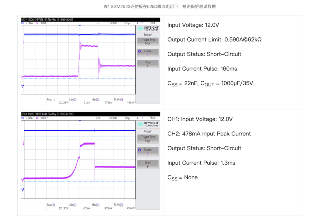 表1顯示了SGM2523評(píng)估板在輸入電壓/電流(12.0V/0mA~12.0V/120mA)、輸出電流限值0.590A@62kΩ時(shí)的短路保護(hù)測(cè)試數(shù)據(jù)