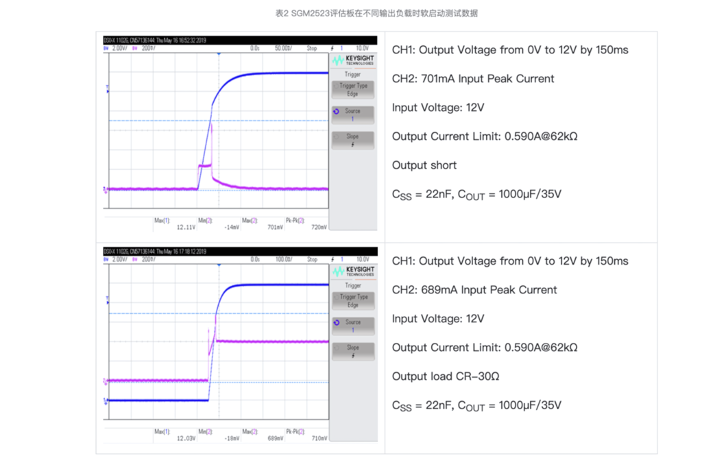 表2左右分別顯示了SGM2523評(píng)估板加載1000μF輸出電容短路啟動(dòng)和加載1000μF輸出電容同時(shí)加載電子負(fù)載(CR-30Ω)軟啟動(dòng)的測(cè)試數(shù)據(jù)。