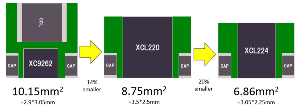 XCL系列由于集成電感線圈,主要周邊部件只有輸入電容和輸出電容,與LDO使用類似;與傳統(tǒng)的分立DCDC相比,顯著縮小了PCB安裝空間,也降低了電路板成本