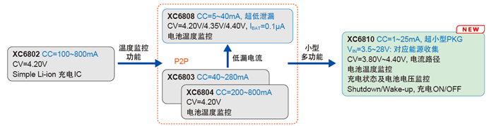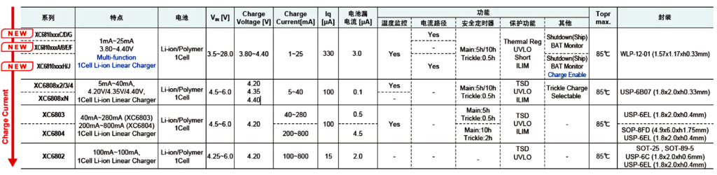 - XC6803/XC6804: CC/CV Charger, CC=~280/800mA,電池溫度監(jiān)測