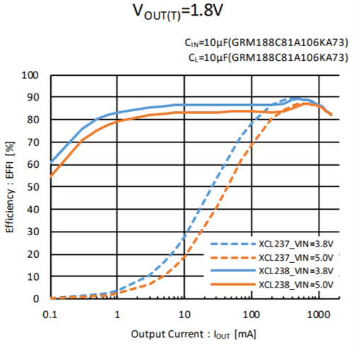 PWM/PFM (XCL238) - Efficiency : 89% (VIN=3.8V, VOUT=1.8V, IOUT=500mA)