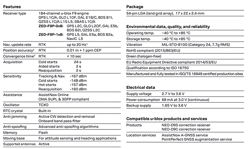 特點(diǎn):ublox公司作為全球領(lǐng)先的定位與無線通信技術(shù)供應(yīng)商,結(jié)合自身綜合實(shí)力與采用最新推出的u-blox F9平臺(tái)的技術(shù),核心創(chuàng)新研發(fā)出可在數(shù)秒內(nèi)提供穩(wěn)定的高精度定位產(chǎn)品ZED-F9P。