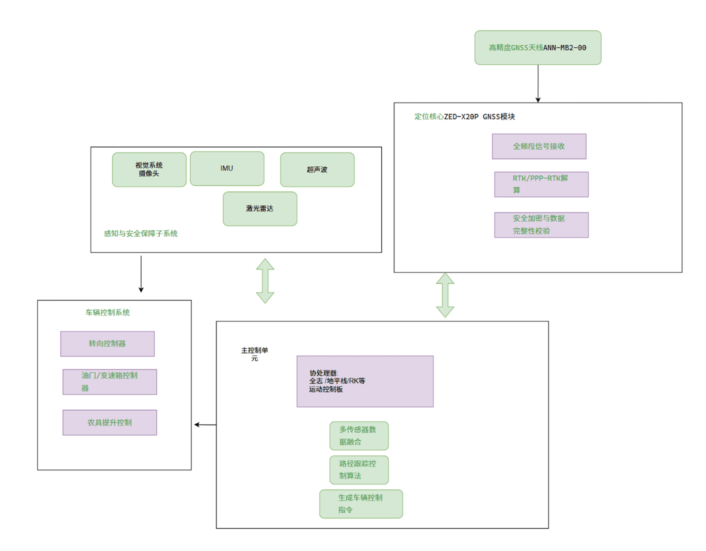 采用域控制器作為大腦。ZED-X20P作為高精度定位單元,通過串口(如UART)或CAN總線將位置、航向、時(shí)間等信息發(fā)送給域控制器。域控制器則同時(shí)接收來(lái)自IMU(獲取姿態(tài)角速度)、攝像頭、激光雷達(dá)等傳感器的數(shù)據(jù),運(yùn)行融合算法,最終計(jì)算出控制指令,通過CAN總線發(fā)送給拖拉機(jī)的轉(zhuǎn)向、油門和農(nóng)具控制系統(tǒng)。